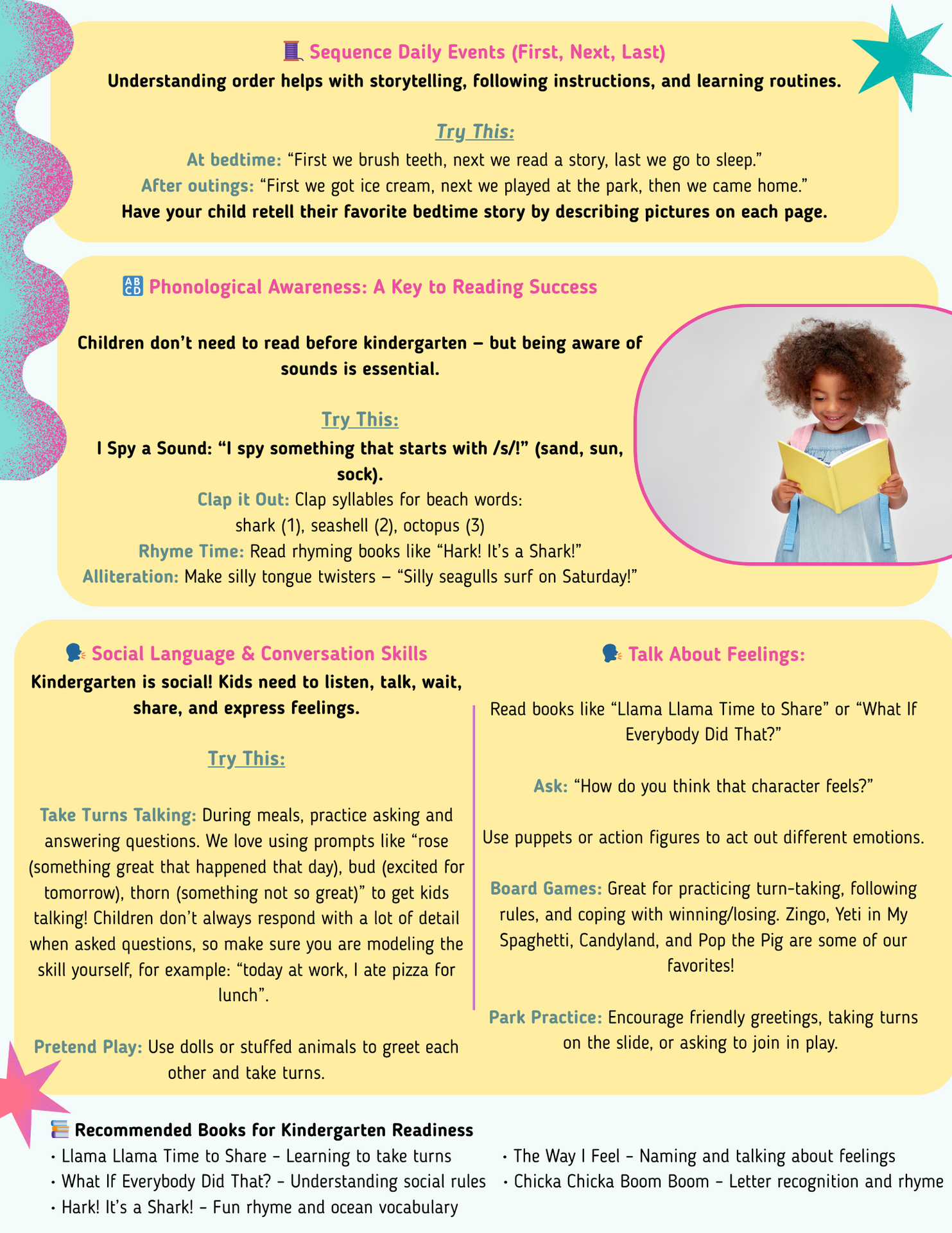 Simple "Try This" activities for spatial concepts, sorting, sequencing daily events, and phonological awareness.
